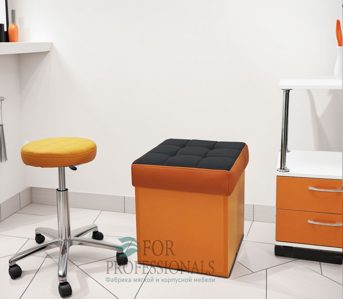Апельсиный кубик с секретом ввиде удобного короба для хранения полезных мелочей и мягким немарким сиденьем.