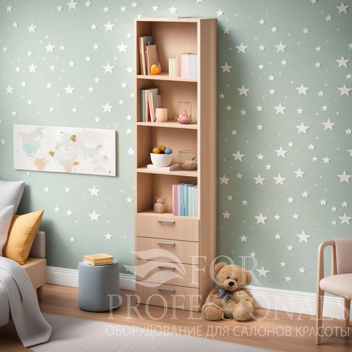 Все игрушки, книги и любимые вещи будут расположены на своих местах, благодаря стильному и функциональному стеллажу в текстуре светлого дерева.