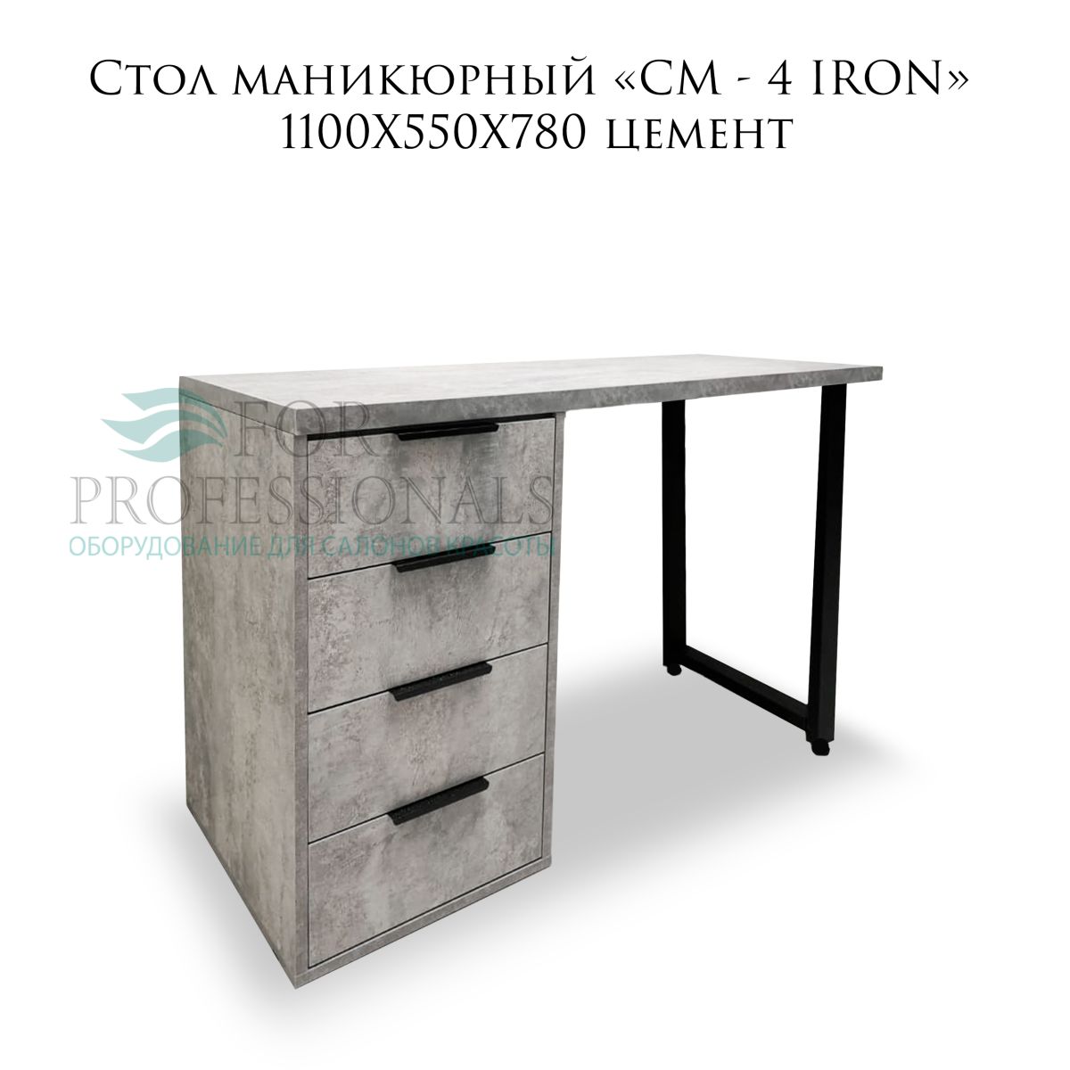 Вместительный маникюрный стол «СМ - 4 IRON», позволяет комфортно чувствовать себя как мастеру, так и клиенту. Четыре вместительных ящика замечательно справятся с необходимостью хранить под рукой всё, что нужно. Прочная металлическая ножка – залог долгой службы стола. ЛДСП, из которого выполнена мебель цвета «Цемент», поэтому стол хорошо впишется в интерьер стиля лофт.