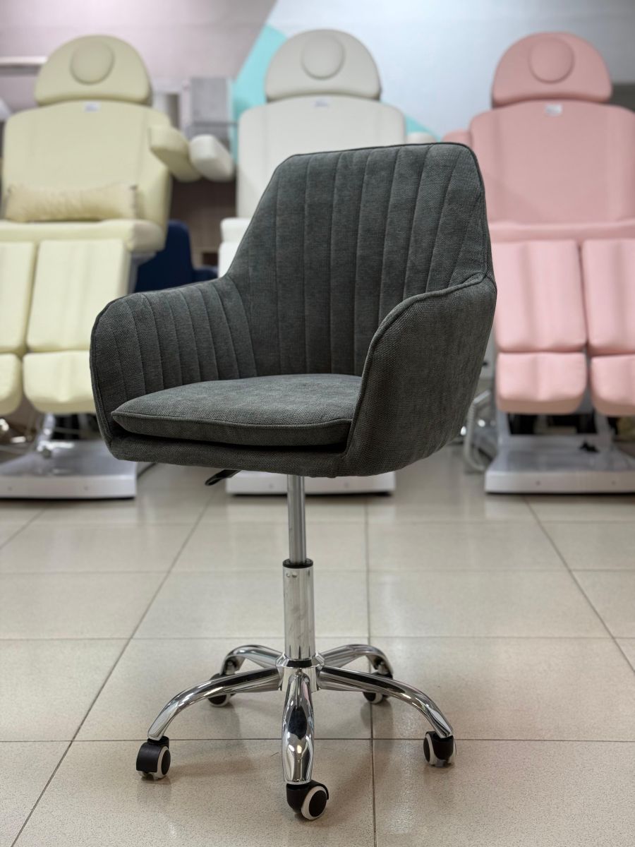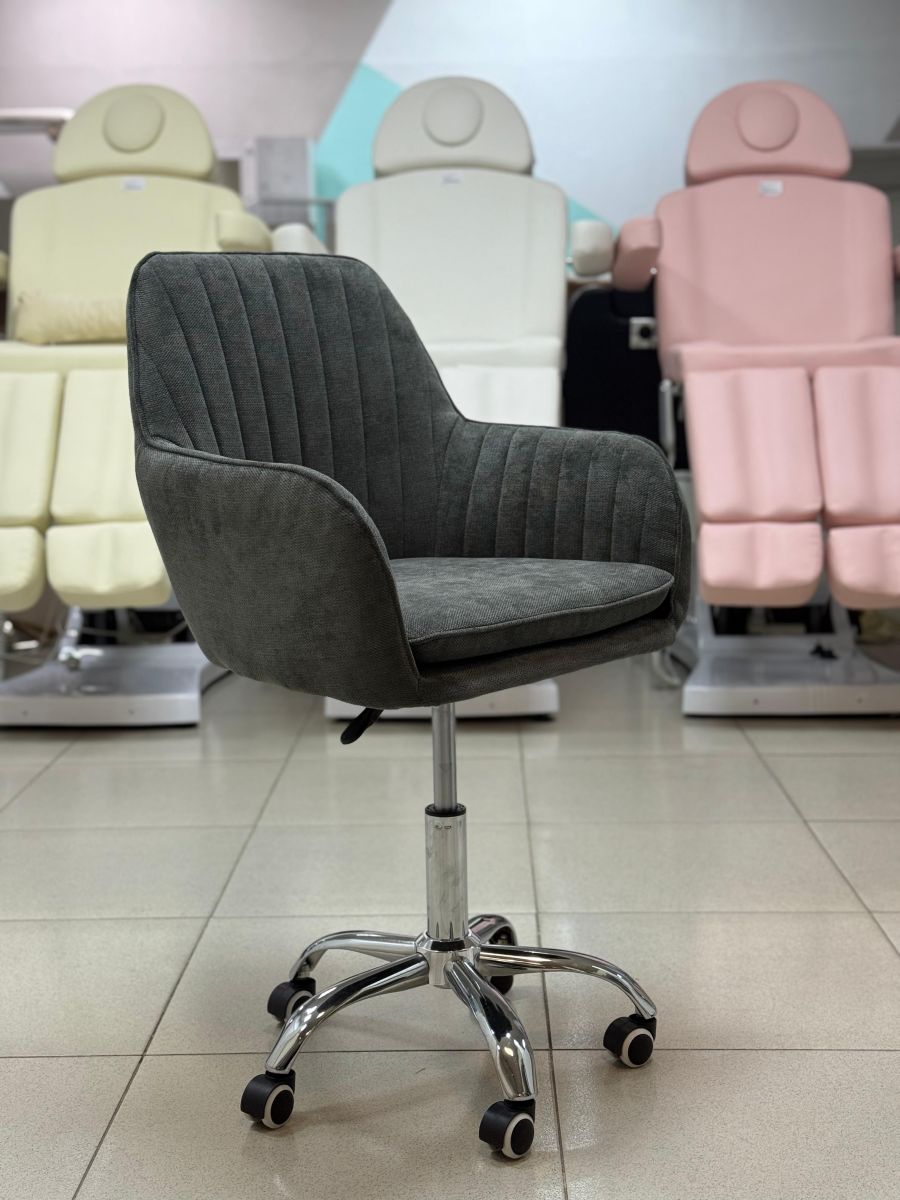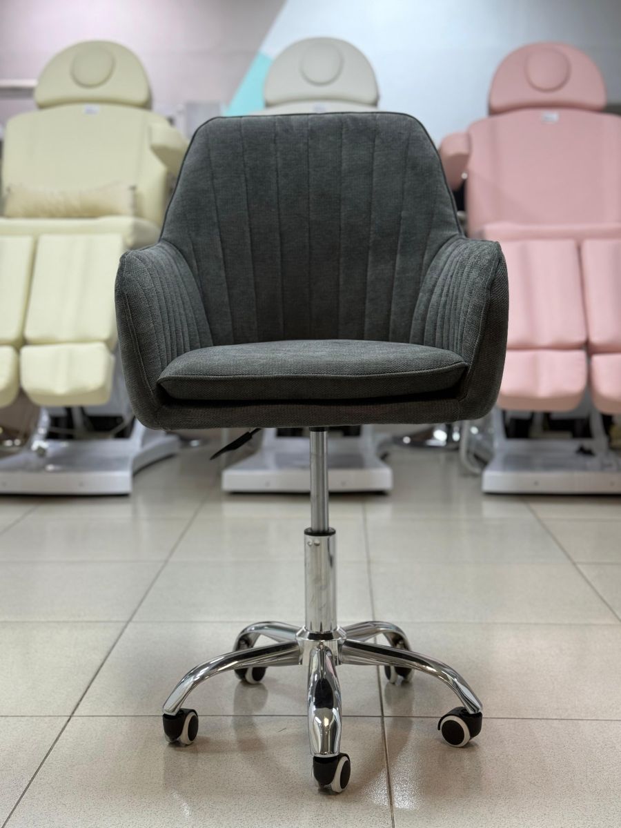 Стул мастера « Макома midi» в обивке из велюра и рогожки на колесах станет украшением любого помещения. Его можно установить как в салоне красоты, так и дома. Сочетание лаконичного дизайна и роскошной обивки делает стул подходящим как для современных, так и классических интерьеров. Высота подлокотников от пола составляет 62 см.
