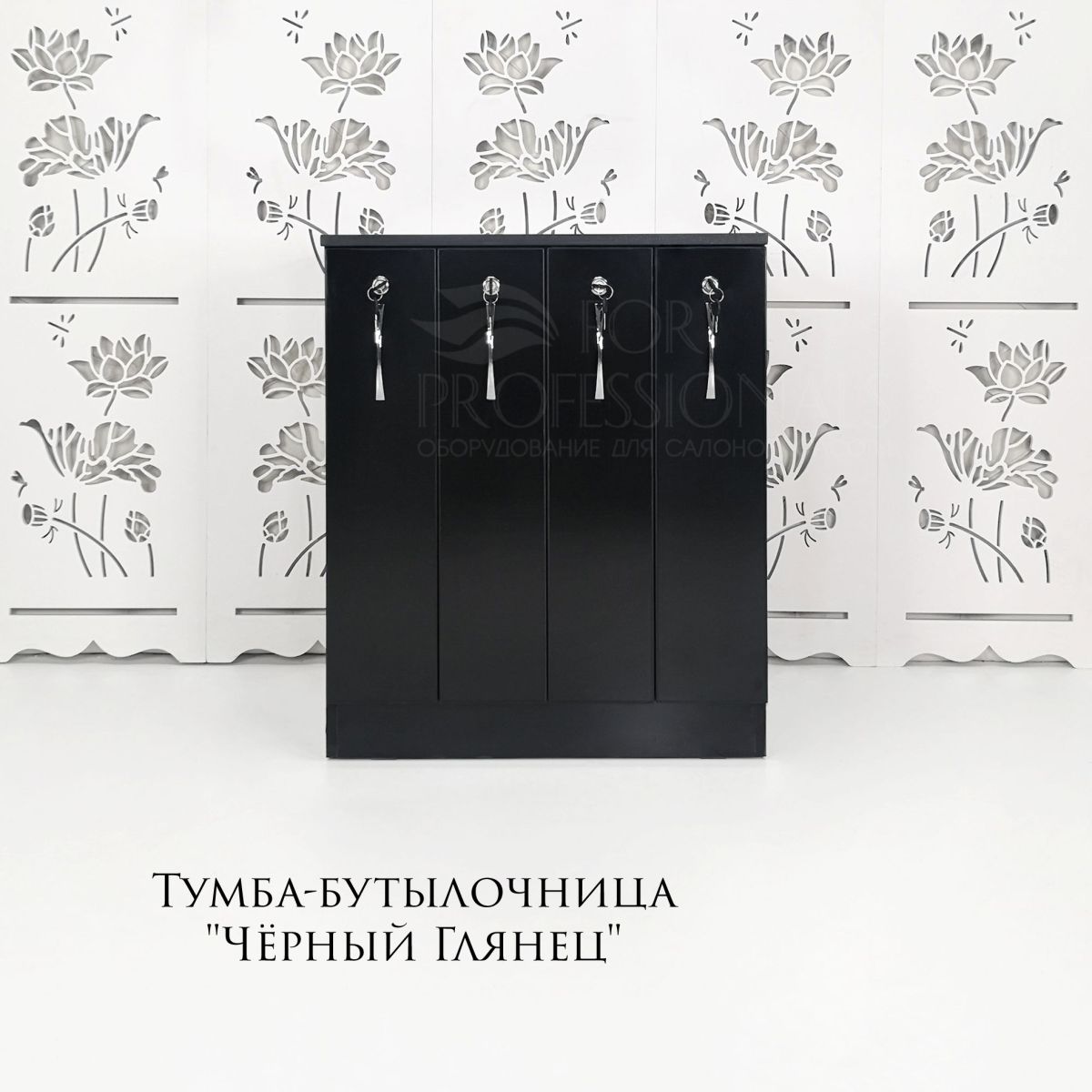 Большая тумба блестящего чёрного цвета, с четырьмя вместительными ящиками-бутылочницами, каждая из которых надёжно запирается на ключ!