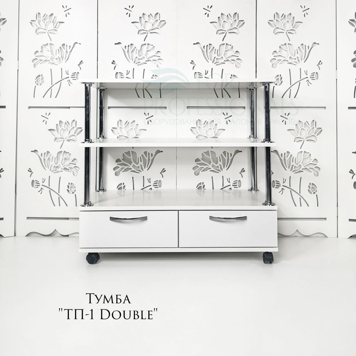 Двойная тумба ТП-1 с двумя ящичками, каждый на своей территории, полочками-крышками и красивыми хромированными подпорками.