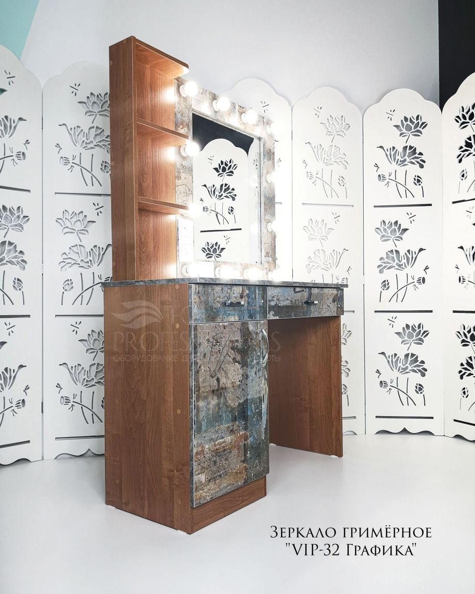 Гримёрное зеркальце-трюмо - совершенное приспособление для мастеров-парикмахеров, визажистов и других труженников красоты! Кроме удобной столешницы и ставших классикой ярких лампочек, сбоку от зеркала есть три четыре полочки, а под столешницей два выкатных ящика.